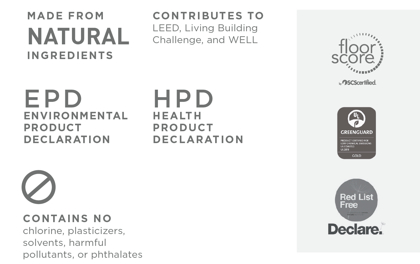 Our bio-based resilient products are a heterogeneous commercial rated polyurethane flooring made from natural ingredients and manufactured in an ecologically responsible factory. It’s a sustainable, high-performance composite material produced from plant-based oils such as canola and naturally occurring mineral components like chalk and does not contain chlorine, plasticizers, solvents, harmful pollutants, or phthalates.